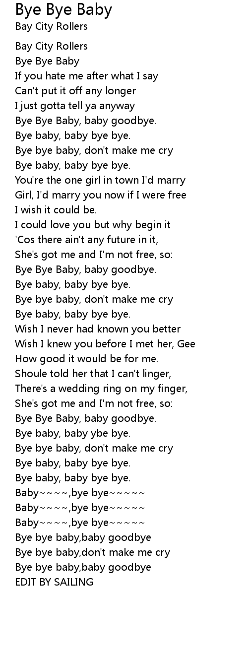 Woke up thinking bout you today Why does it have to be this way We drove each other crazy Bye bye babe Bye bye baby Well I guess its over a. Bye Bye Baby Lyrics by Bay City Rollers from the Live in Japan album - including song video artist biography translations and more. Theres a wedding ring.