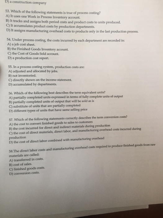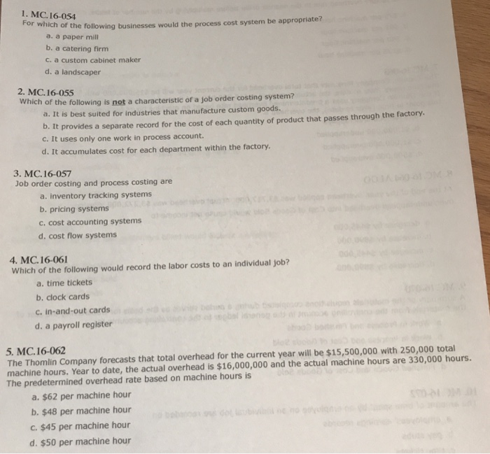1For which of the following businesses would a process cost system be appropriate. For which of the following businesses would a process cost system be appropriate. Debit Factory Overhead credit Work in Process b. Allocating departmental costs between completed and partially completed units C. 1 For which of the following businesses would a process cost system be appropriate. The machine has a book value of 40000 and a remaining useful life of 5 years at which time its salvage value will be zero. For which of the following businesses would a process cost system be appropriate.