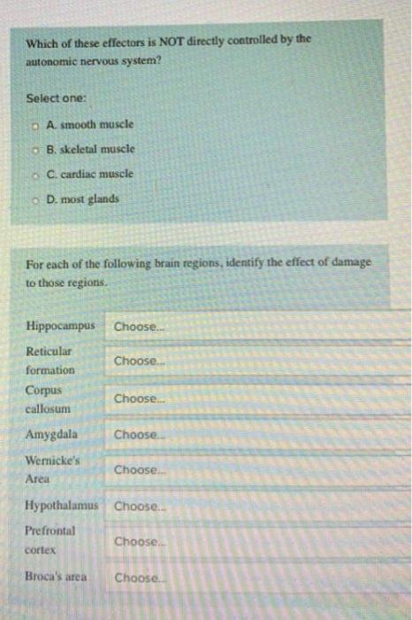 The somatic and autonomic nervous systems differ in all of the. Which of these effectors is NOT directly controlled by the autonomic nervous system. Smooth muscle in blood vessels e.